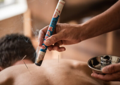 Mugwort herb (Artimisia herb) in certain conditions which need ‘warming’ and tonification of the vital energy. Shaped like a cigar, and consisting of packed herb, the moxa is burnt just off the skin in order to warm and stimulate the relevant points.